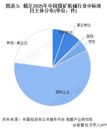 截至2025年10月,我国煤矿机械行业招采单元从体次要为国有企业,招采单元为一般企业的项目占比为23。0%,病院、学校为招采单元的项目数量占比相对较小。